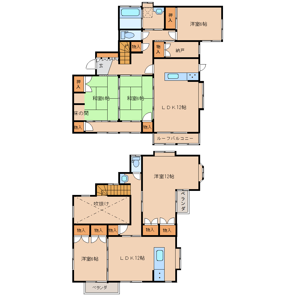 1F:和6、和6、洋6、サンルーム、LDK12/2F:洋6、洋12、LDK12