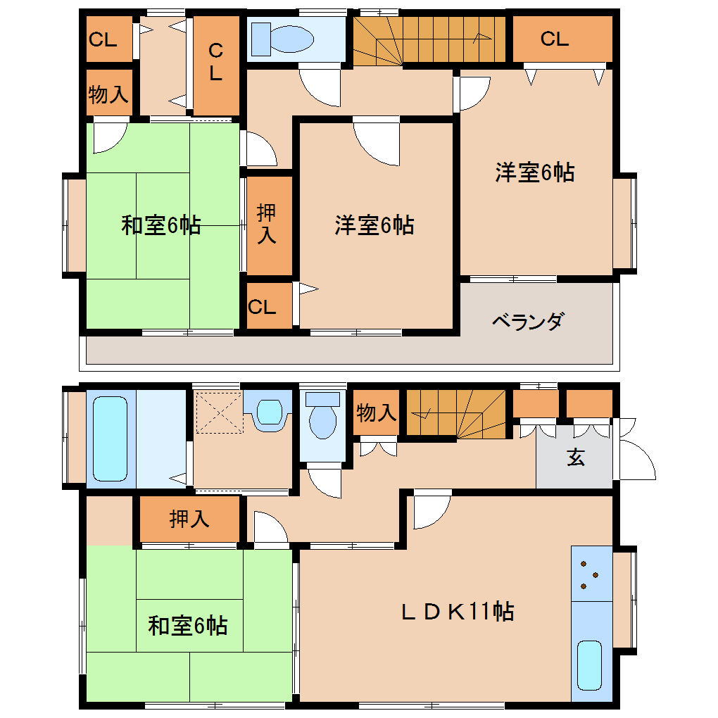 1階:和室6帖、LDK11帖 2階:和室6帖、洋室6帖、洋室6帖
