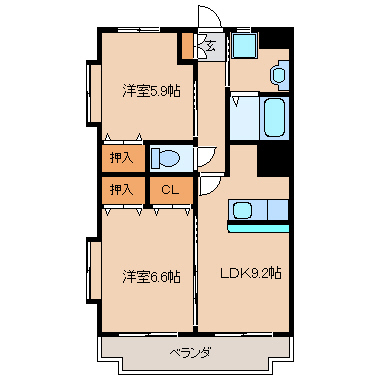 洋室6.6帖+洋室5.9帖+LDK9.2帖