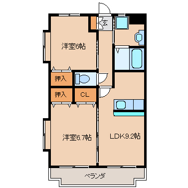 洋室6.7帖+洋室6帖+LDK9.2帖 |