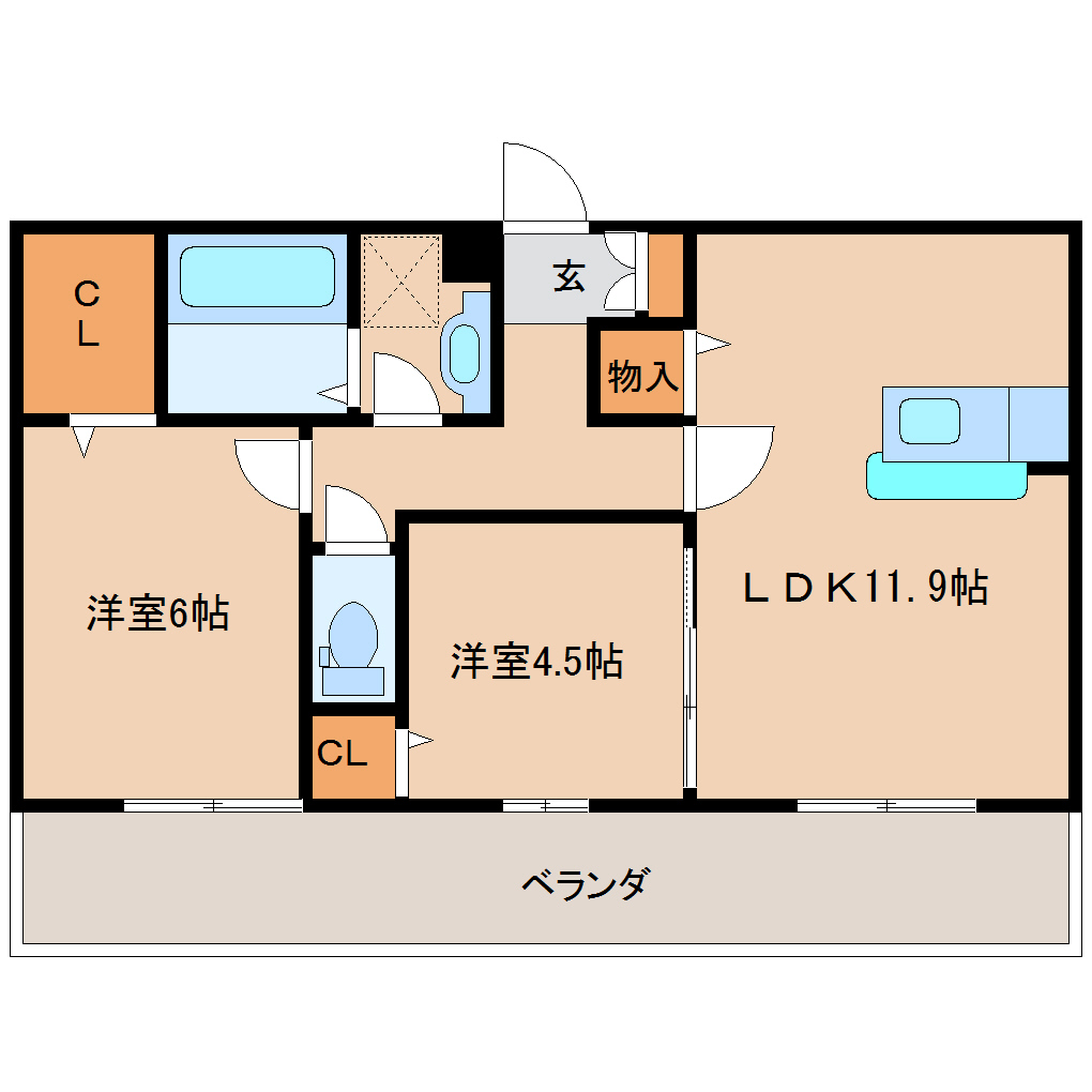 | ◎間取内訳 | 洋室4.5帖、洋室6帖、LDK11.9帖 |