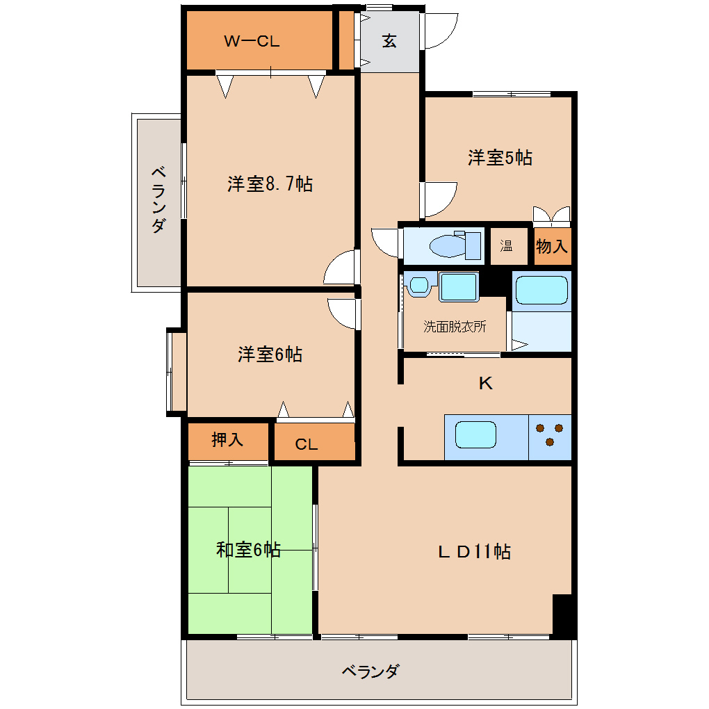 和室6帖、洋室8.7帖、洋室6帖、洋室5帖、LD11帖、K、ウォークインクローゼット